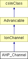 Inheritance diagram for AHP_Channel: ![]() Detailed DescriptionAHP model with constant activation gating function and constant step increase of the calcium concentration.Reference: Fuhrmann G, Markram H, Tsodyks M. Spike frequency adaptation and neocortical rhythms. J Neurophysiol. 2002 Aug;88(2):761-70.